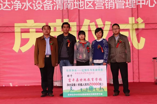 2015年伊始,榮事達(dá)水工業(yè)公司與安徽省青年志愿者協(xié)會共同發(fā)起了“樂享凈水——讓快樂與生命同在”助殘公益項(xiàng)目,活動一經(jīng)發(fā)起就受到了各地代理商的積極響應(yīng),截止目前,累計(jì)向康復(fù)中心、特殊學(xué)校、助殘機(jī)構(gòu)等350多個(gè)單位捐贈凈水設(shè)備2000多套,受惠人口超過50000人。除此之外,代理商們還主動為社會其他人群提供幫助,遼寧遼陽代理商就為當(dāng)?shù)丨h(huán)衛(wèi)工人設(shè)置榮事達(dá)飲水站,解決其工作期間的飲水問題;江蘇大豐舉行了“關(guān)愛生命,凈享水源”百村助民活動,當(dāng)?shù)卮砩桃罁?jù)實(shí)際情況為各村鎮(zhèn)服務(wù)機(jī)構(gòu)安裝凈水機(jī),方便村民接水飲用。