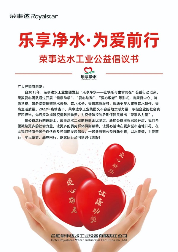 - 榮事達(dá)水工業(yè)向全國各地合作伙伴及經(jīng)銷商發(fā)起公益倡議,呼吁大家一起參與到公益行動(dòng)中來,以水傳情,為愛前行,牢記使命,感恩同行,以實(shí)際行動(dòng)同創(chuàng)時(shí)代美好!
