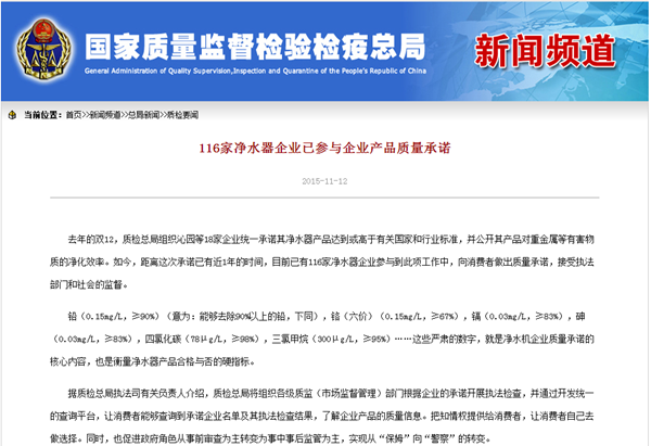 質(zhì)檢總局|116家凈水器企業(yè)參與企業(yè)產(chǎn)品質(zhì)量承諾 榮事達(dá)位列前茅